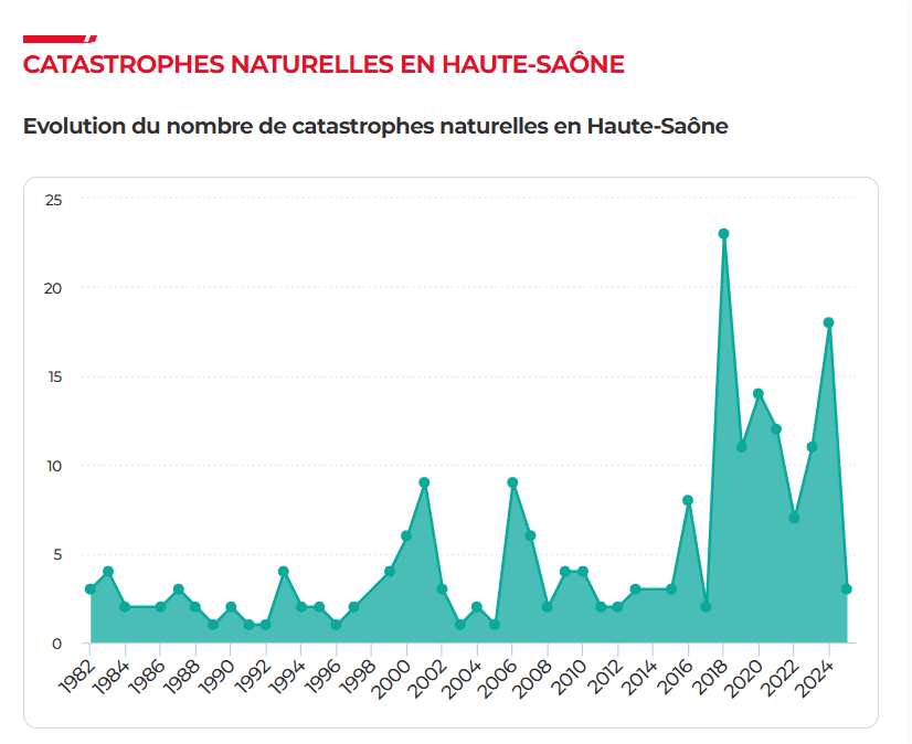 Le graphique montre une évolution globalement modérée des catastrophes naturelles en Haute-Saône jusqu’au milieu des années 2010.